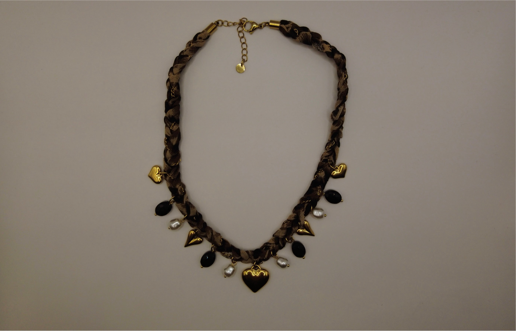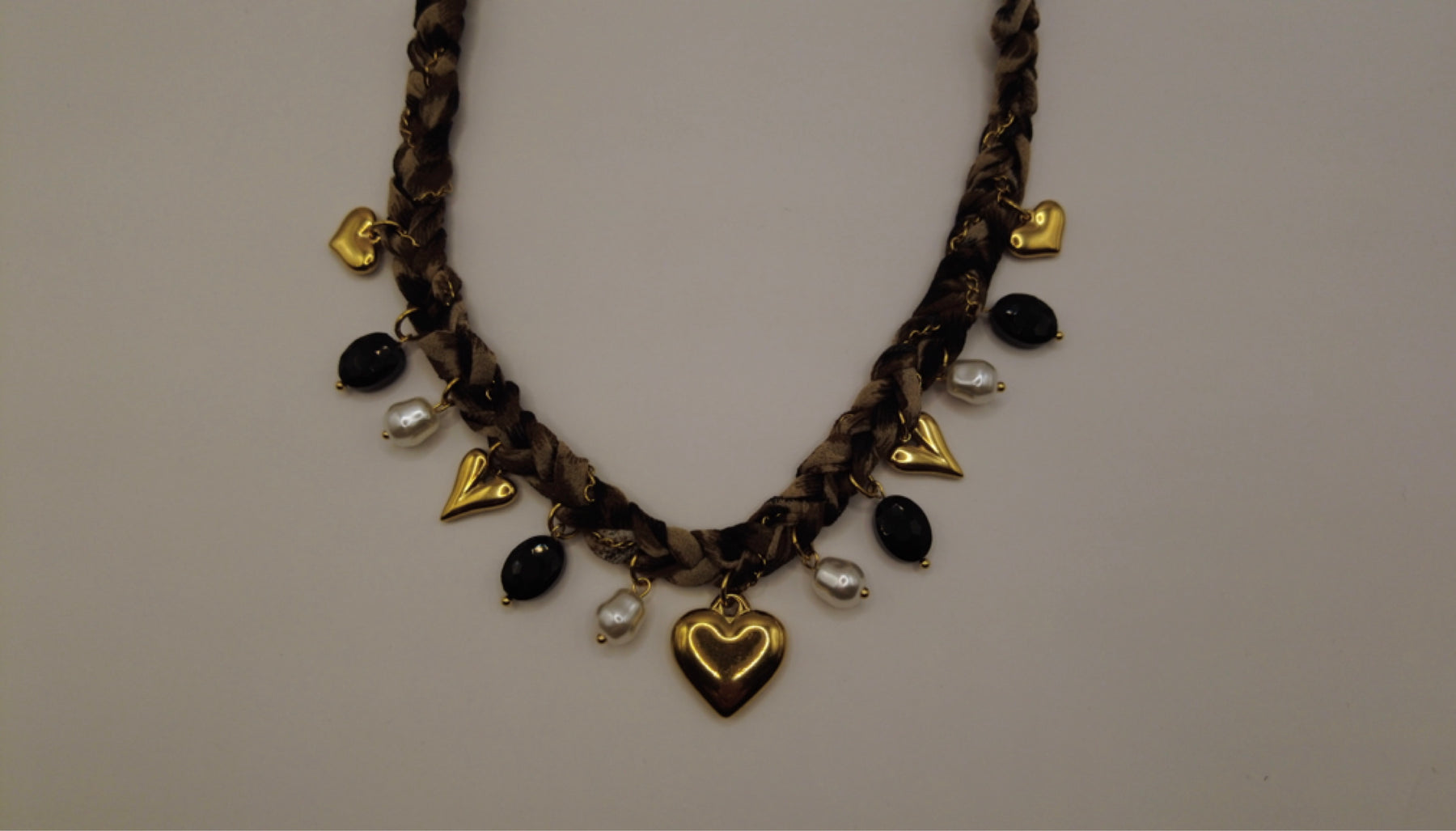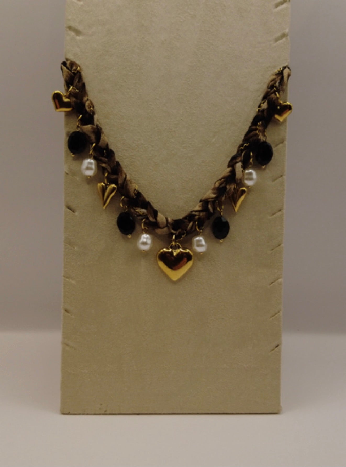 Deze unieke statement ketting combineert speelse charme met luxe details. De gevlochten band is versierd met goudkleurige hartjes, glanzende parels en elegante zwarte kralen. Een opvallend gouden hart in het midden maakt de ketting helemaal af. Perfect om een simpele outfit direct een stijlvolle en chique uitstraling te geven.